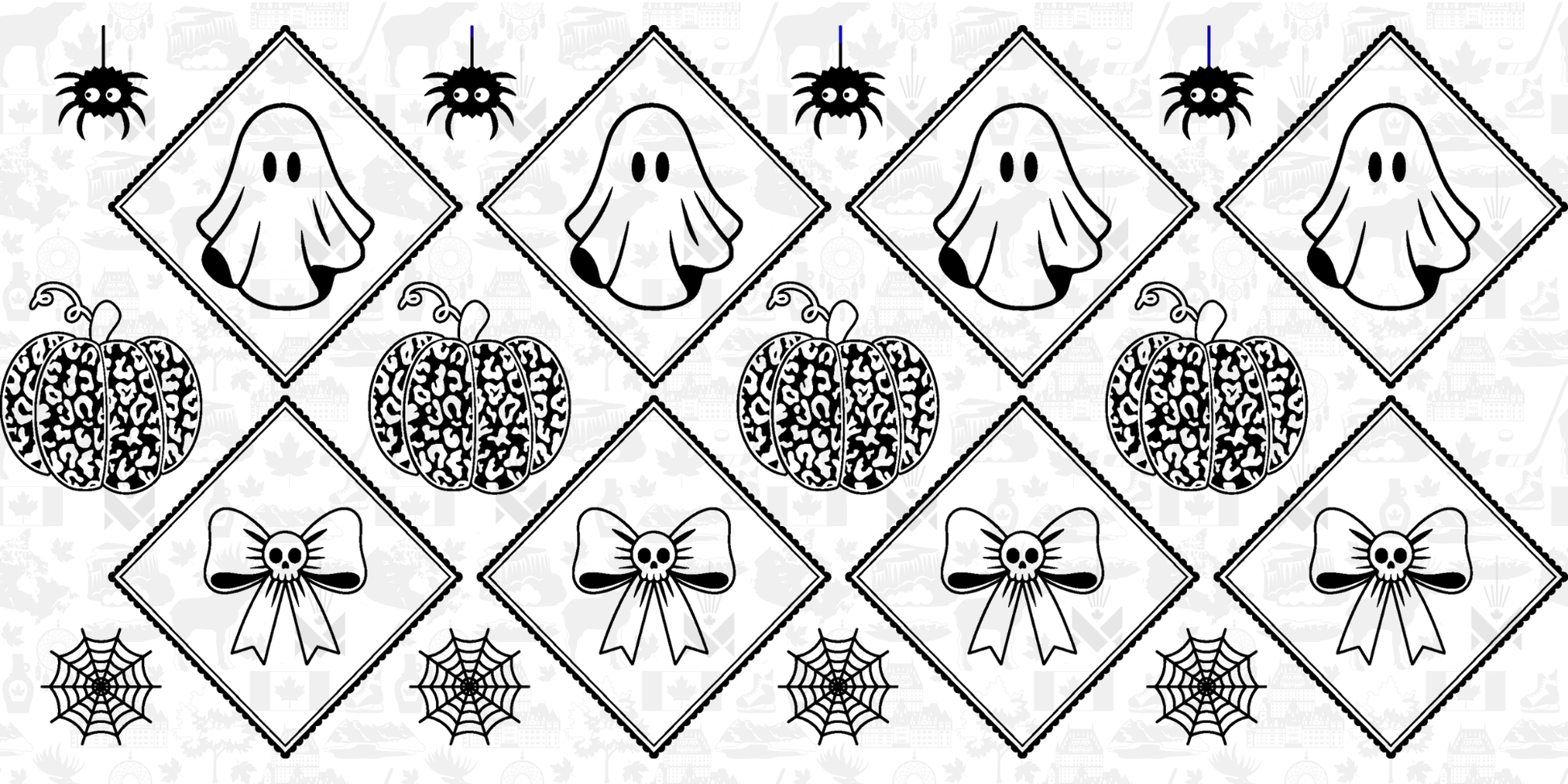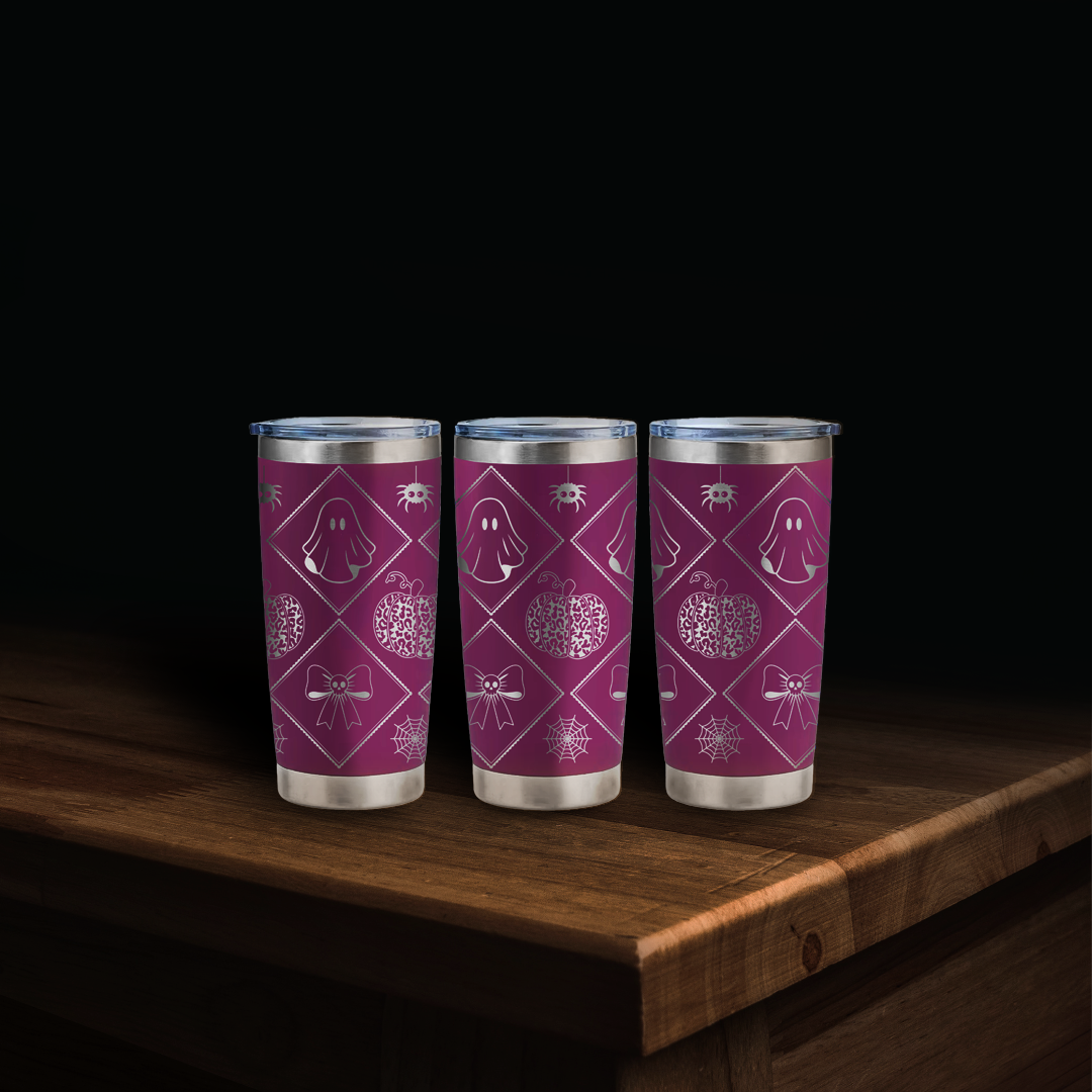 Playful meets spooky in this Leopard Print Ghost Halloween wrap! Featuring cute ghosts, leopard print pumpkins, spiderwebs, skull bows and a cute spider. This design adds a fashionable twist to your tumbler engraving lineup. It engraves beautifully on Maverick Laser Supplies' powder coated laser engraving 20oz tumbler blanks.